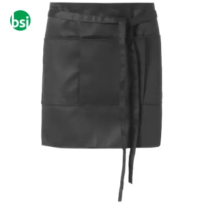 Customizable short twill apron, 65% polyester and 35% cotton. Features 3 pockets, with printing and embroidery options. Fast delivery!