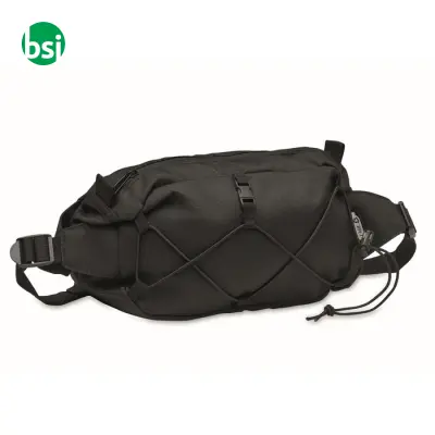 600D RPET waist bag, lightweight and practical with a zipper, adjustable belt, and inner pocket. Available in black, customizable with various techniques.