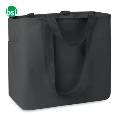 High-quality 600D polyester shopper, practical with pockets and handles. Ideal for any occasion, available in black. Discover customization options!
