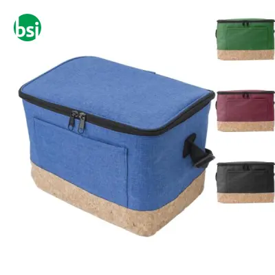 Thermal bag made of 600D polyester, perfect for six cans. Practical design with cork bottom and adjustable shoulder strap. Available in various colors.