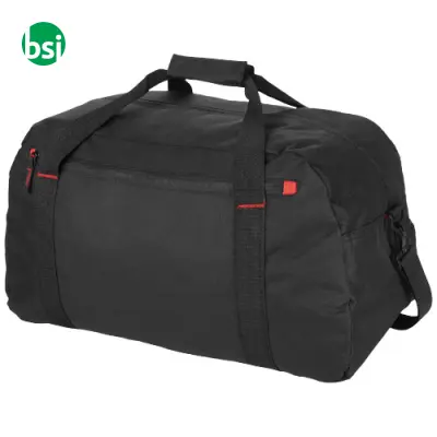 Customizable Vancouver 35L travel bag, spacious and durable in 600D polyester. Perfect for any trip, available in black and red.