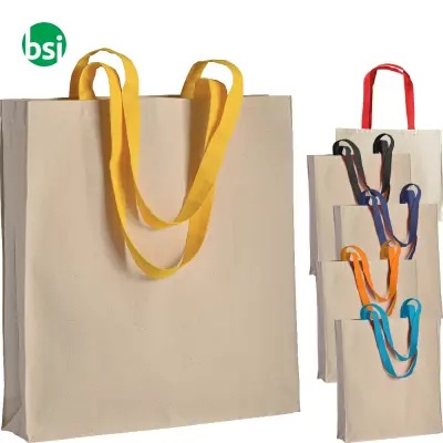 Customizable cotton shopper 38x42x8 cm, colored handles. Available in various colors. Minimum order 20 pieces. Ideal for eco-friendly promotions!