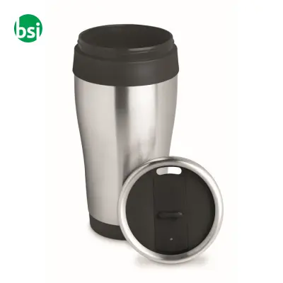 TRAM 455ml stainless steel thermal mug, anti-drip. Perfect for take-away drinks. Customizable with various printing techniques.