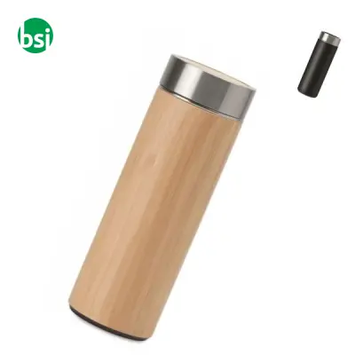 Stainless steel and bamboo double layer 400ml water bottle, with tea infuser. Stylish and practical, perfect for any occasion.