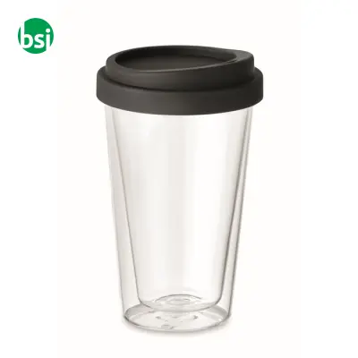 Borosilicate glass cup with silicone lid, 350ml capacity, stylish and customizable. Perfect for any occasion!