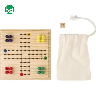 Rubber wood Ludo game, elegant and compact. Includes cotton bag. Customizable with various printing techniques.
