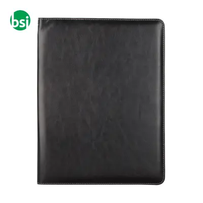 A4 PU document holder with pad, pen, and card holder. Customizable, lightweight, and practical. Size 31x24x2 cm.