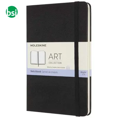 Moleskine sketchbook, medium size, hard cover, high-quality customizable paper. Ideal for artists and creatives.