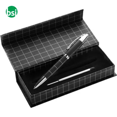 Elegant customizable metal ballpoint pen available in black and silver. Perfect for corporate gifts, comes with a gift box.
