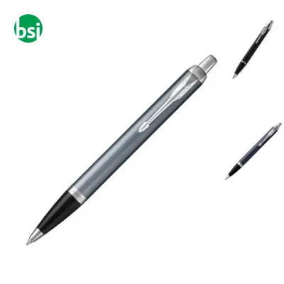 Parker IM lacquered brass ballpoint pen, elegant and customizable. Includes blue refill and gift box. Available in various colors.
