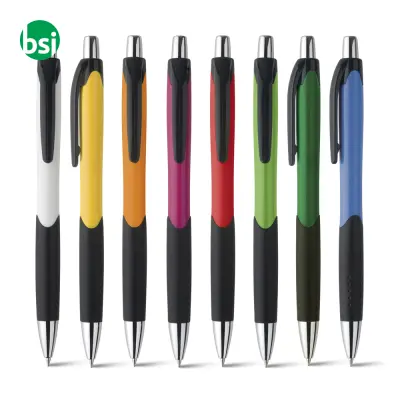 Ballpoint pen in ABS with anti-slip grip, available in various colors. Customizable with digital or pad printing. Minimum 50 pcs.