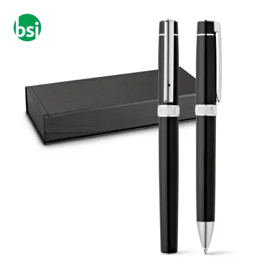 Stylish set of metal rollerball and ballpoint pens, with gift box. Customizable with engraving or printing, perfect for gifts and events.