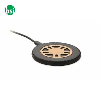 15W wireless charger made of recycled ABS with a bamboo top. Fast charging, compatible with iPhone and Android. Choose sustainability!