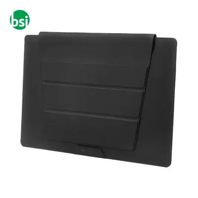 Elegant and practical recycled polyester laptop bag. Features wireless charging and transforms into a workspace wherever you are.