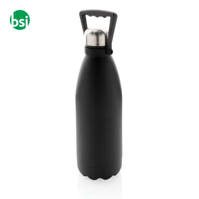 1.5L Recycled stainless steel thermal bottle: keeps drinks hot for 5 hrs, cold for 15. Eco-friendly, practical, available in black and white!