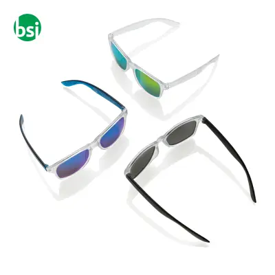 Recycled PC sunglasses with mirrored lenses, 72% recycled material, high UV protection. Choose style and sustainability!